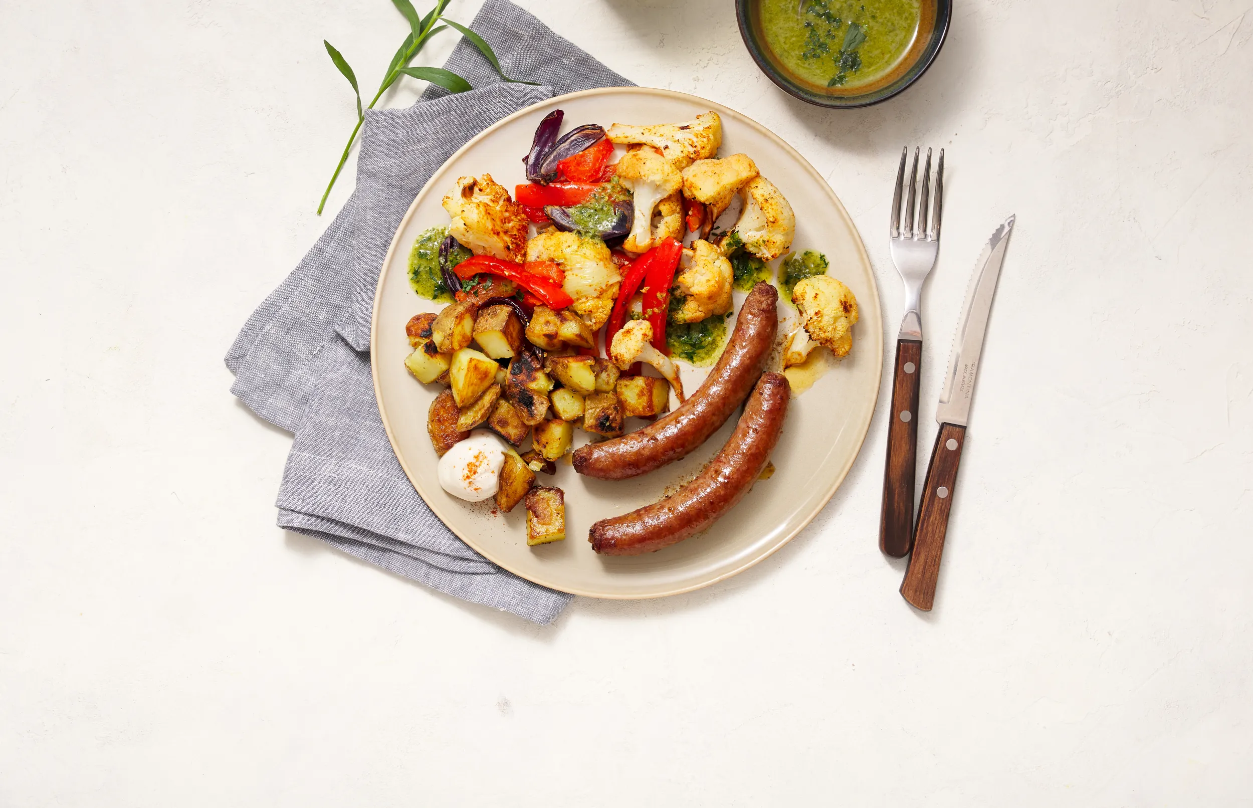 Serveer de worstjes met de groenten en aardappeltjes. Verdeel de dragondressing naar smaak over de groenten. Eventueel met wat mayonaise bij de aardappeltjes, ook lekker.