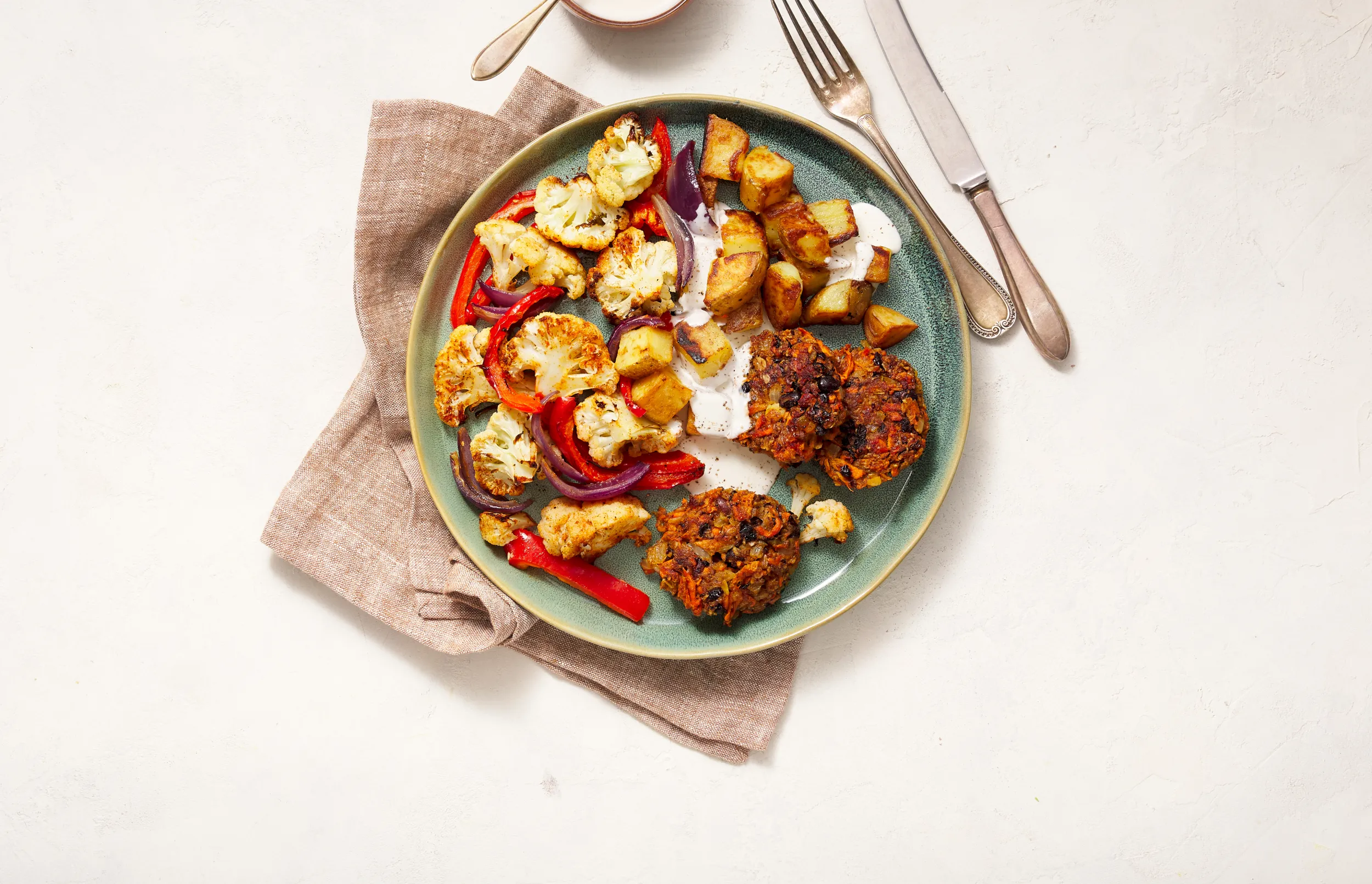 Serveer de burgertjes met de groenten en de gebakken aardappeltjes en de yoghurtsaus.