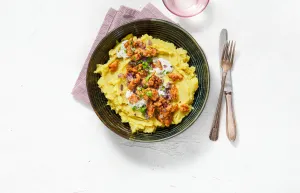 Giet de aardappelen en zoete aardappel af en bewaar wat kookvocht! Stamp tot puree en maak smeuïg met wat kookvocht en een scheut olijfolie extra vierge. Breng op smaak met zout en peper. Meng 1 tl Ras el Hanout specerijen door de stamp en serveer met het kipköftegehakt en winterse de ‘tzatziki'.