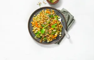 Verwijder alleen de dikke stelen van 35 g waterkers en hak grof. Schep voorzichtig door de tabouleh, samen met een scheut olijfolie extra vierge. Bestrooi met de zonnebloem- za'atar-crunch en serveer.