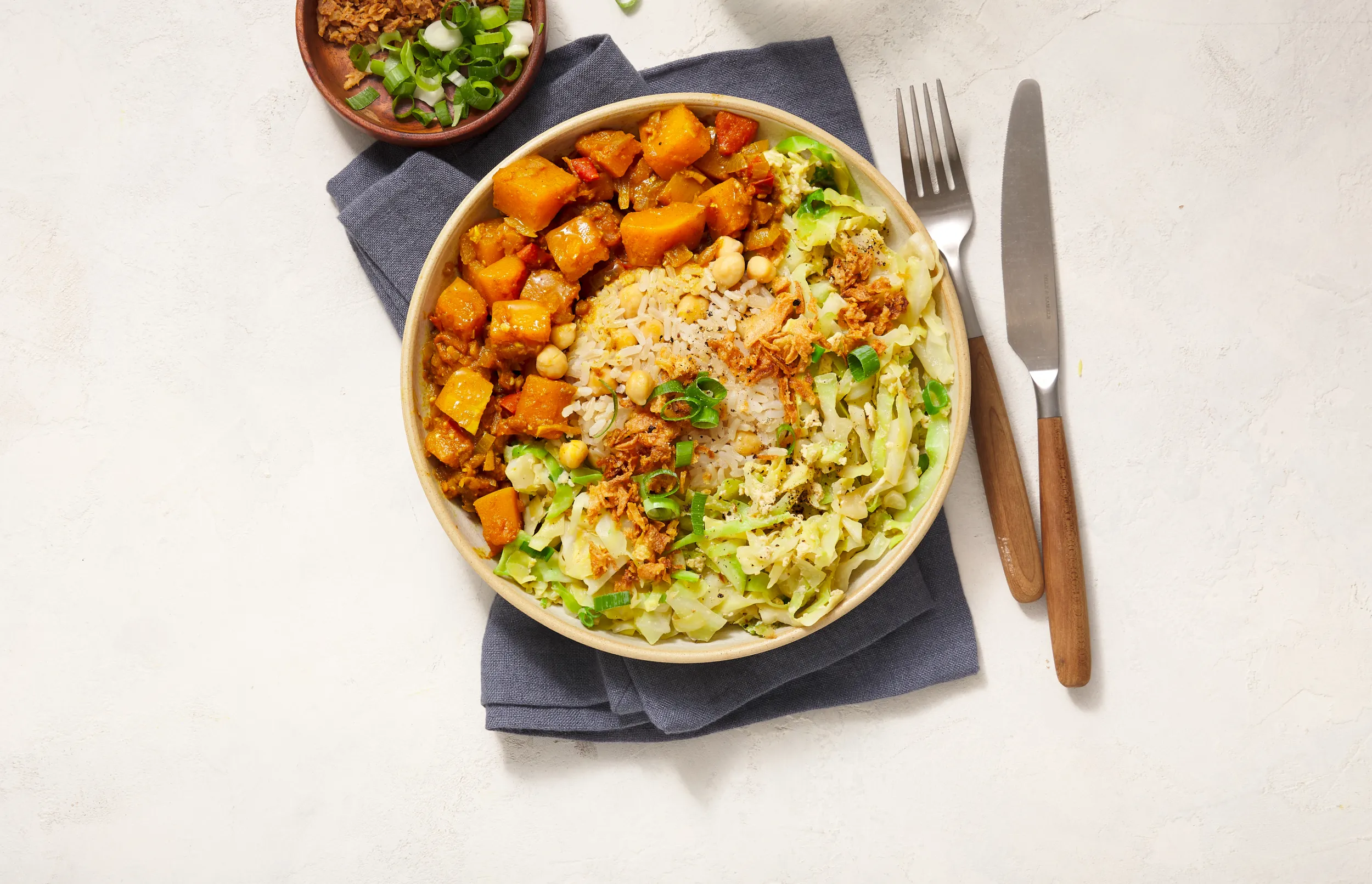Breng de pompoencurry vlak voor het aan tafel gaan op smaak met 1 el miso en een kneepje citroensap. Serveer met de rijst en spitskool. Garneer met ½ bakje gebakken uitjes,en lente-ui.