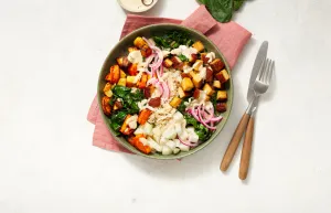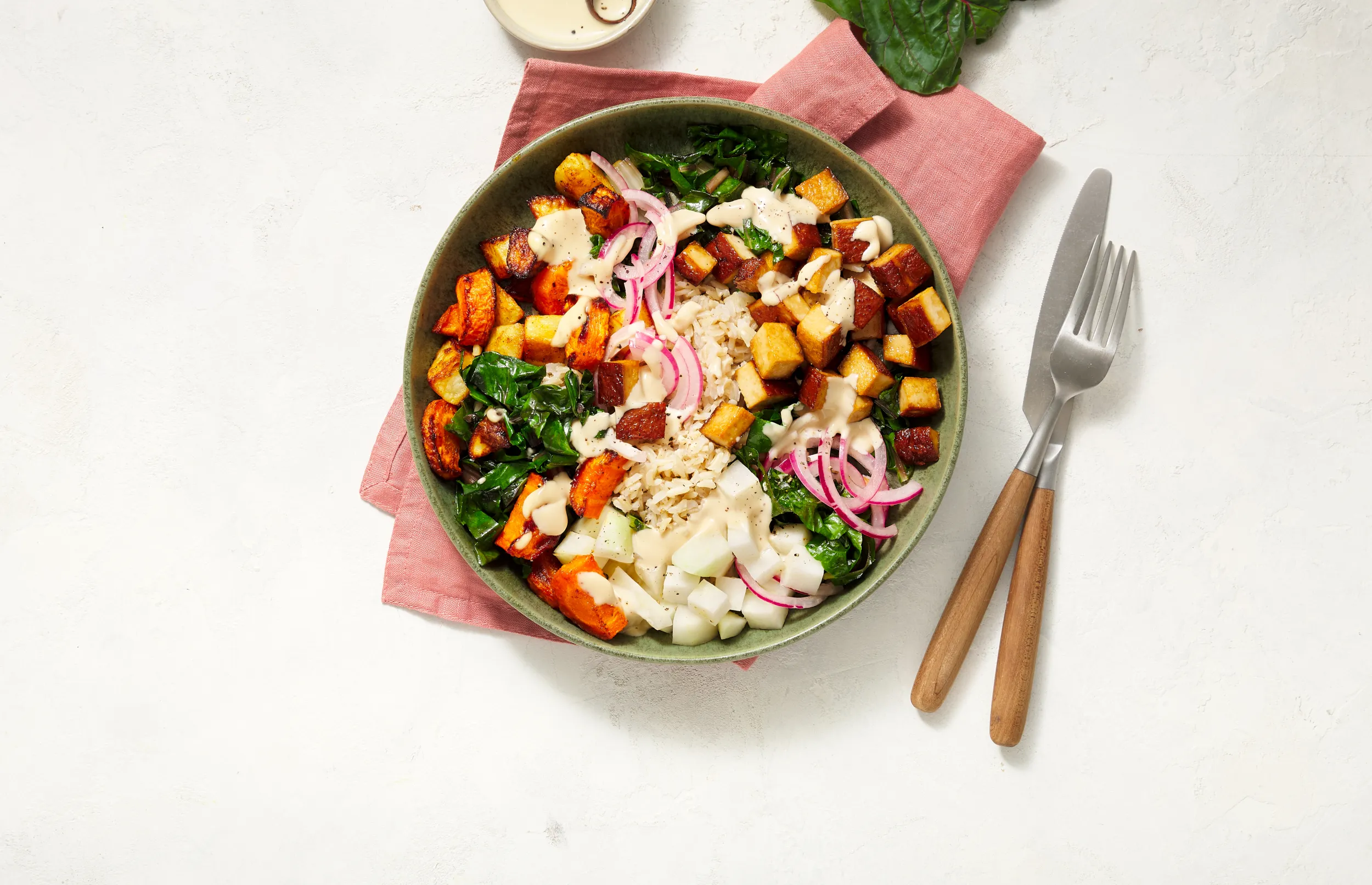 Maak een bowl met rijst, ovengroenten, koolrabi, snijbiet, ingelegde rode ui en tofu. Serveer met de mayo-sojasaus.