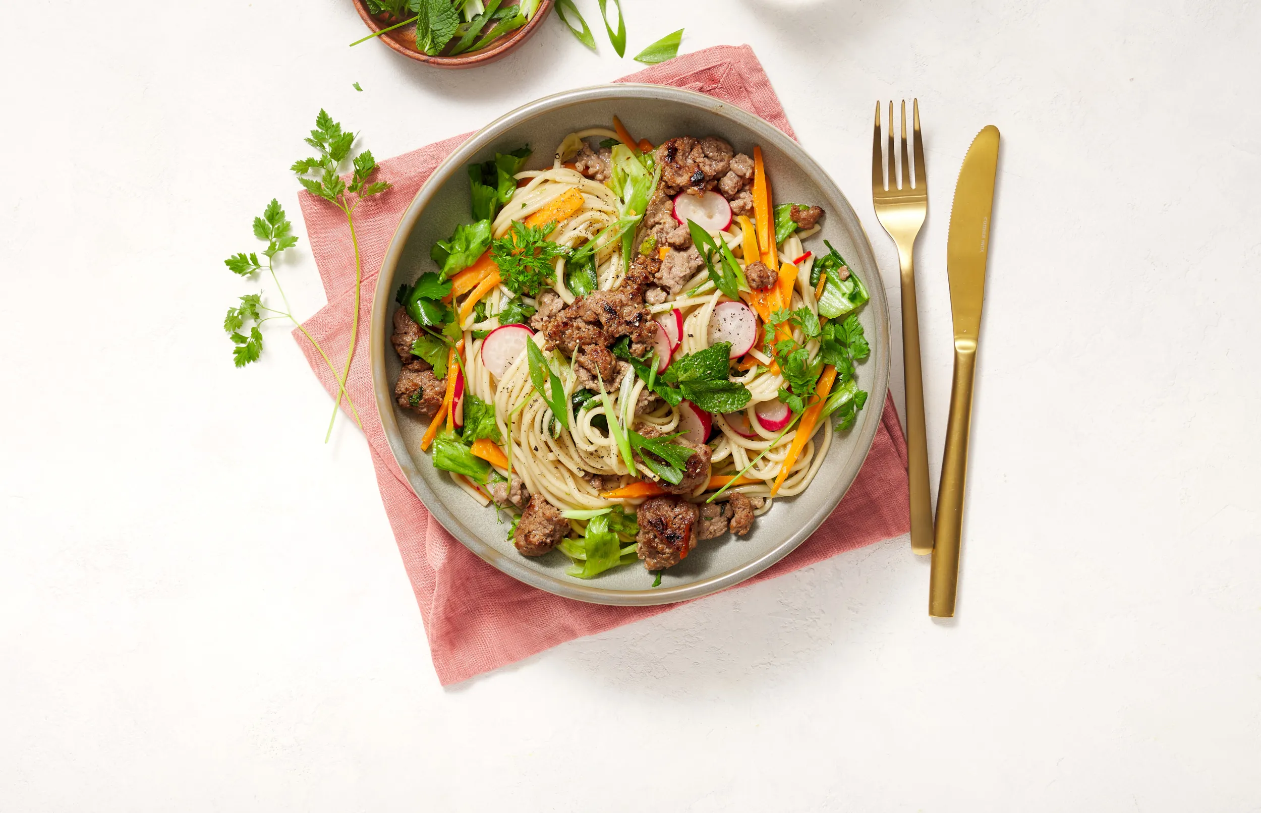 Voeg het gehaktmengsel bij de noedels, samen met de radijs (inclusief azijn). Garneer met de lente-ui-ringetjes.