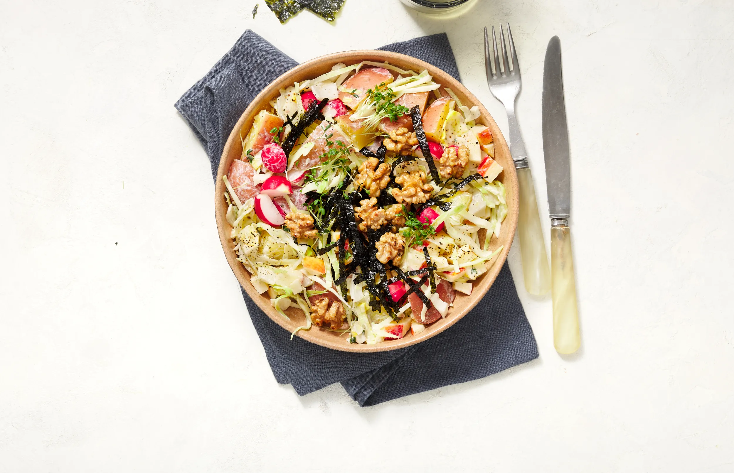 Beemster Valery-salade met witlof, appel, tuinkers, crispies en walnoten