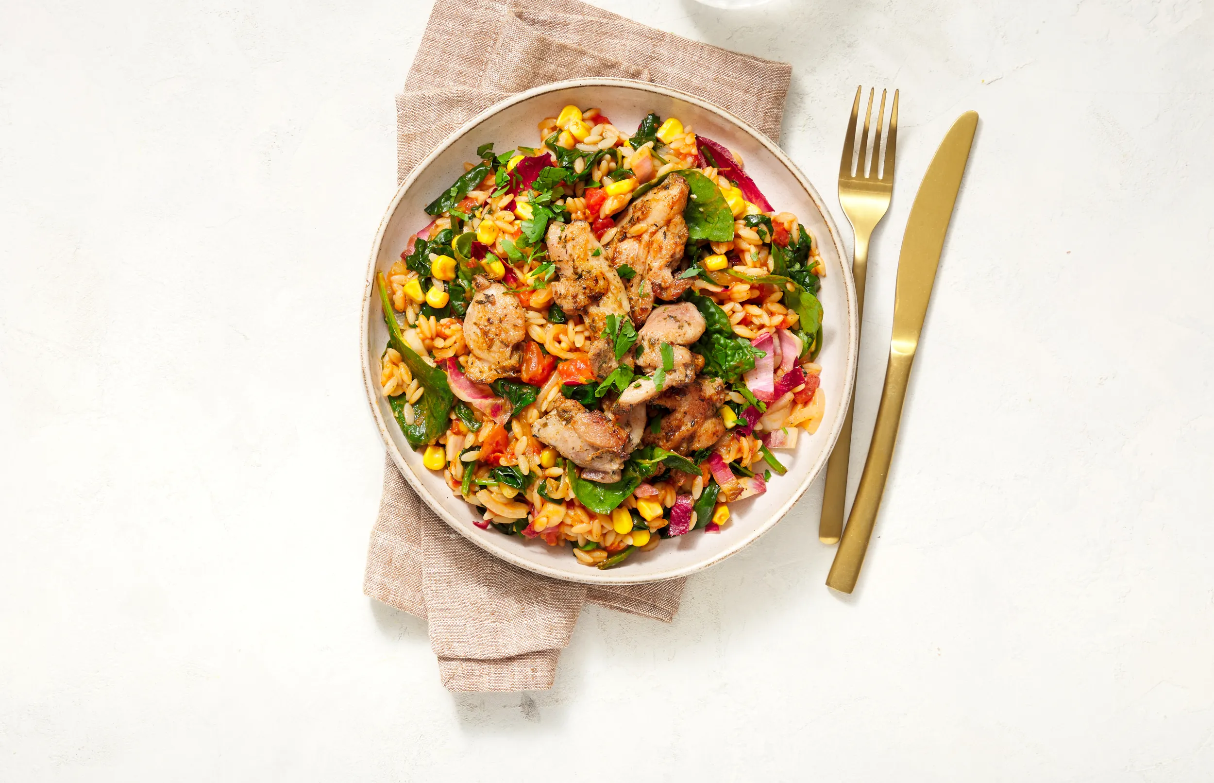 Proef of de orzo gaar is. Schep de mais en 175 g spinazie erdoor tot het is geslonken. Voeg de roodlof toe, schep nog een paar keer om en zet het vuur uit. Breng op smaak met zout en peper.
