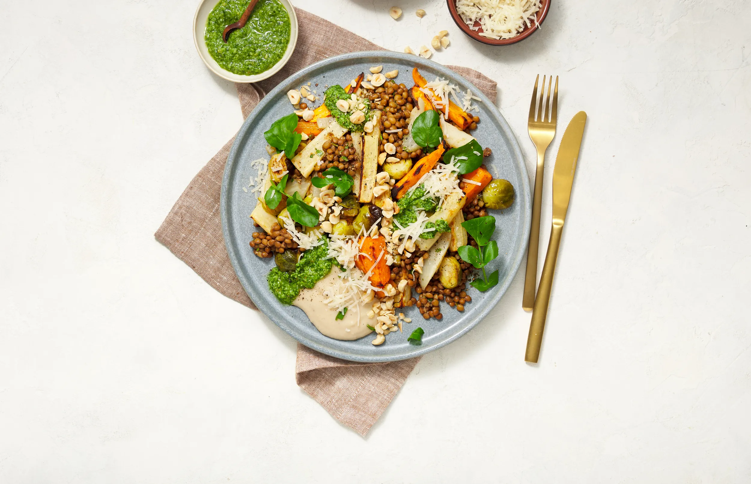 Geroosterde herfstgroenten met balsamico-linzen, romige bonendip en pesto Hollandaise