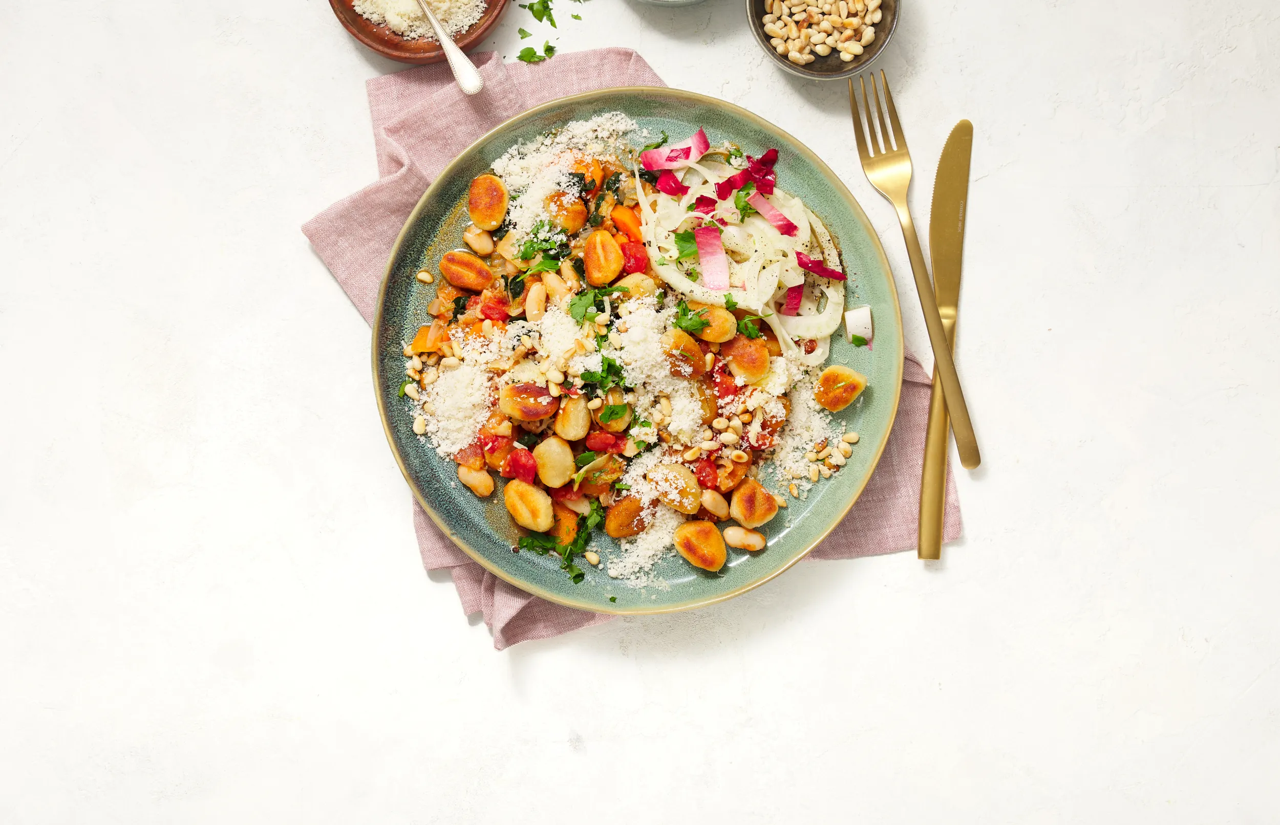 Schep de gnocchi op en verdeel de tomatensaus erover. Garneer met 50 g vegan kaas, pijnboompitjes en peterselie. Serveer samen met de roodlof-venkelsla.