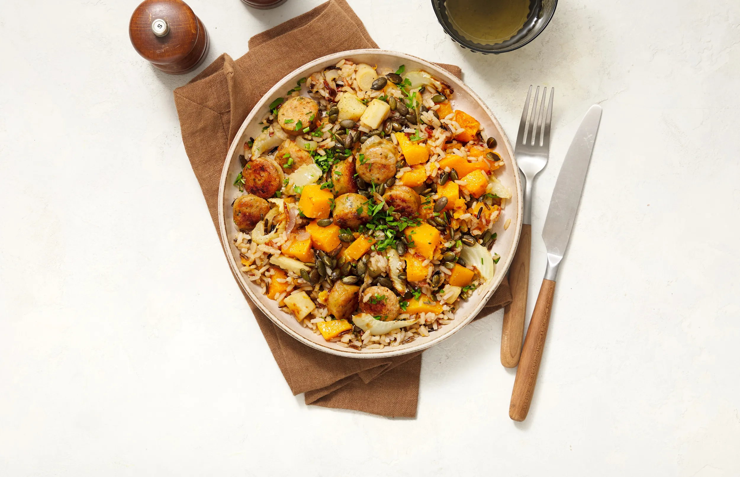 Meng in een slaschaal de gemengde rijst met de groenten uit de oven en de dressing. Breng op smaak met zout, peper en evt. nog een kneepje citroensap. Serveer de plakjes worst en sjalot op de rijst en garneer met pompoenpitten.