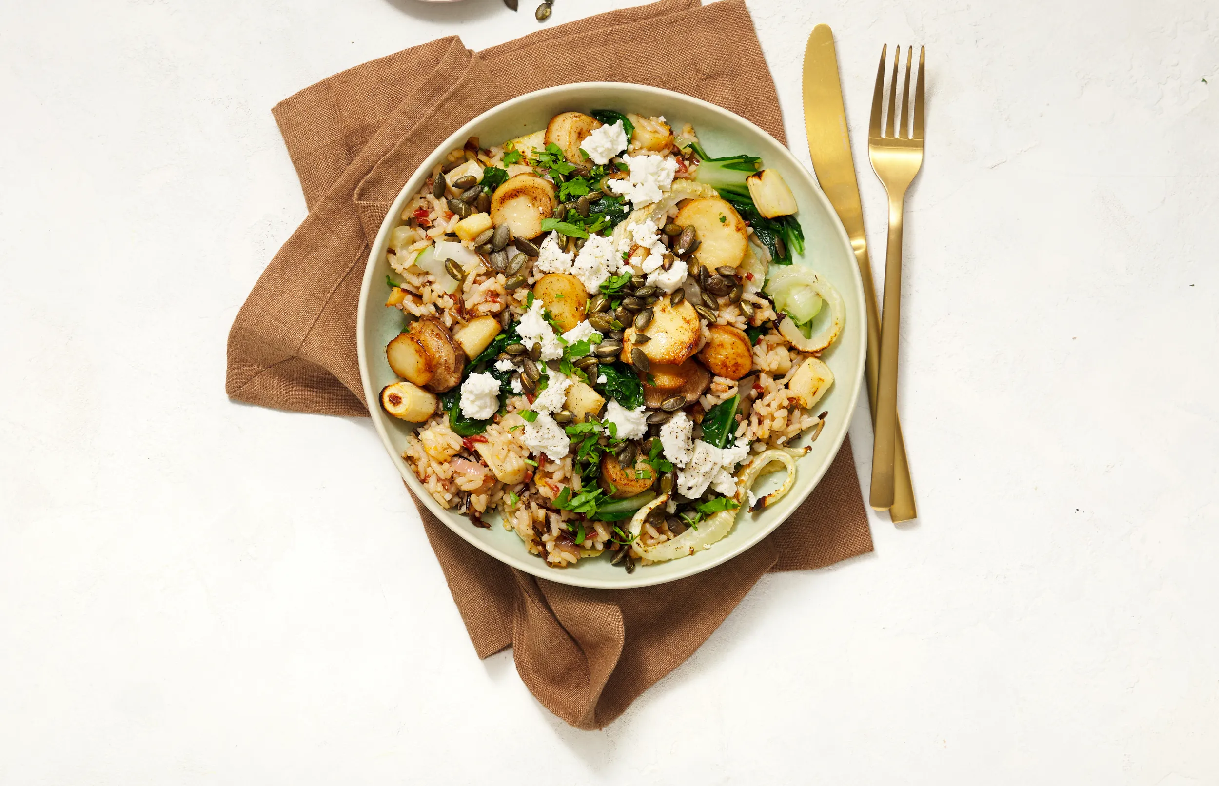 Gebakken boleten met gemengde rijst, groenteroerbak, feta, pompoenpitten en vinaigrette
