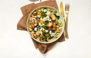 Meng in een slaschaal de gemengde rijst met de groenten uit de oven en de dressing. Breng op smaak met zout, peper en evt. nog een kneepje citroensap. Serveer de boleet en sjalot erop, garneer met 50 g feta en pompoenpitten.