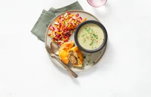 Serveer de soep met een 2 tl yoghurt en garneer met de fijngehakte peterselie. Serveer de salade en pie’s erbij.