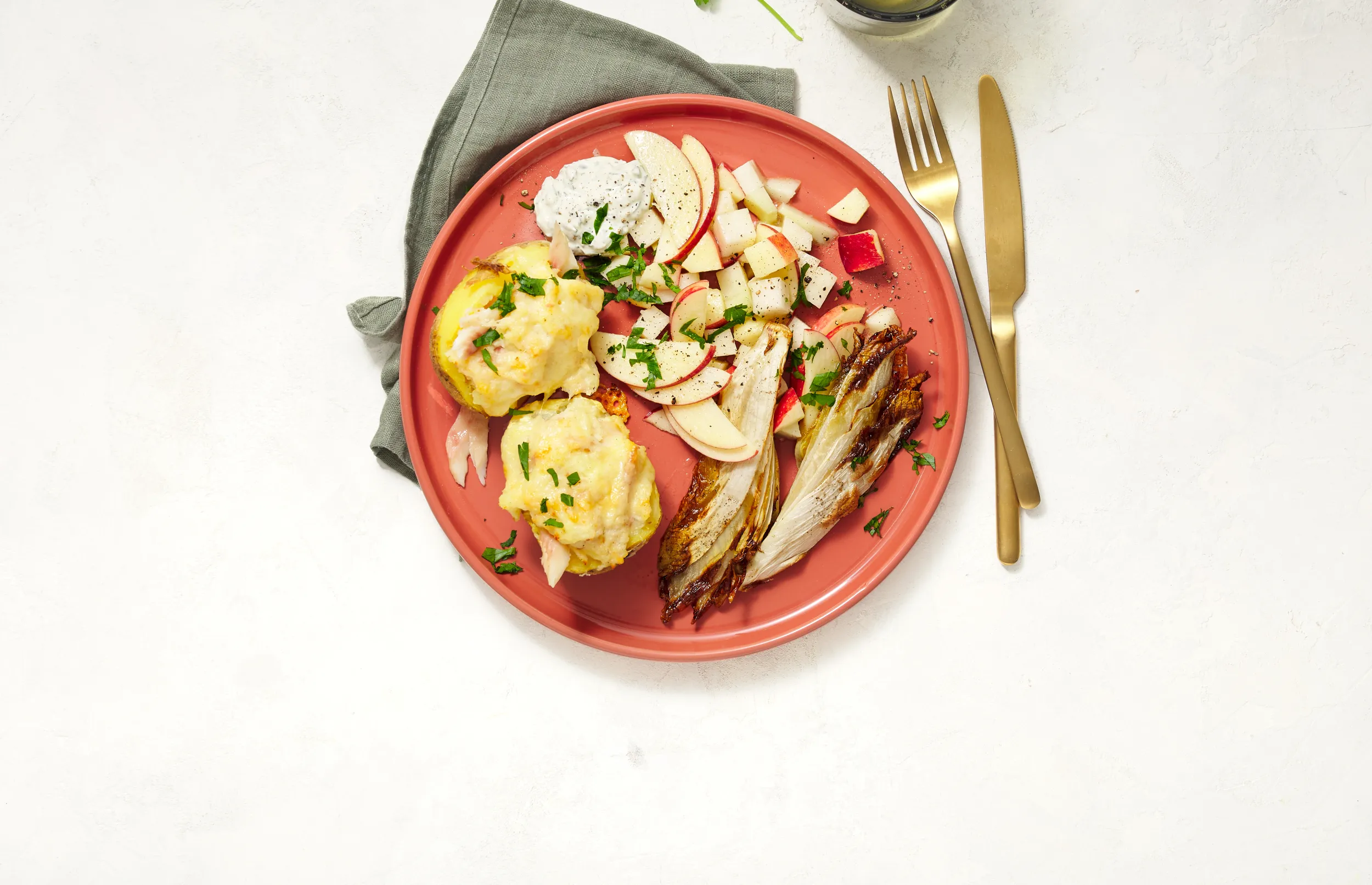 Serveer de gepofte aardappel met de crème fraîche, witlof en de salade.