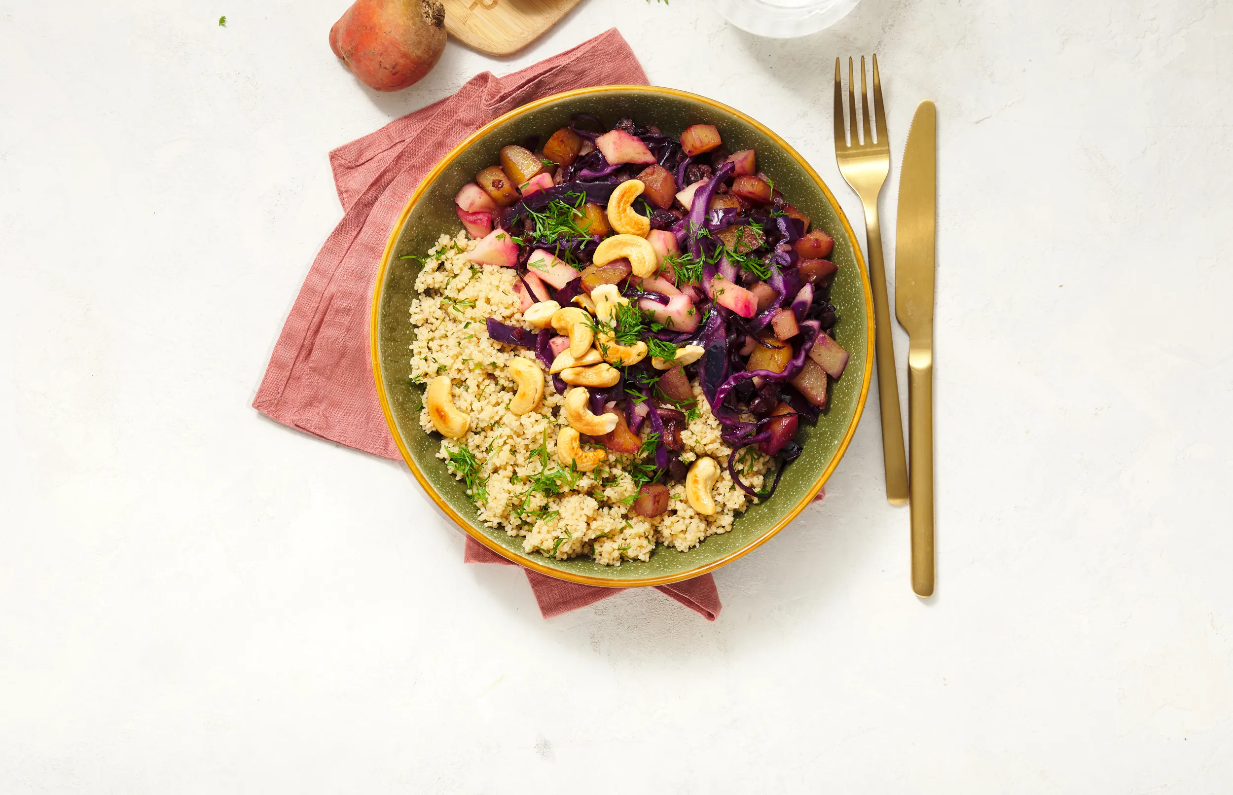 Serveer de Oosterse roerbak met de couscous en garneer met de cashewstukjes en dille.