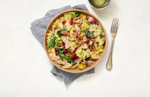Voeg als de timer gaat 150 g gesneden groene kool bij de pasta en kook samen nog ca. 7 minuten tot beide gaar zijn. Bewaar wat kookvocht(!) bij het afgieten en spoel de pasta en kool koud af.