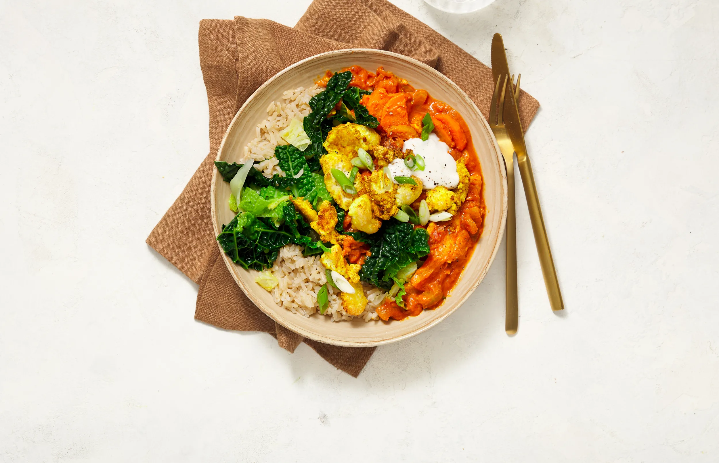 Goed om te weten: In het specerijenbakje (voor 2p) zit: ½ tl kurkuma, ½ tl korianderpoeder, ½ tl komijnpoeder, ½ tl gemalen fenegriekzaad, 1/8 tl chilivlokken. In het bakje voor 4p zit het dubbele.