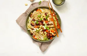 Breng een ruime pan water met zout aan de kook. Kook, als het water kookt, 150 g noedels gaar in 8-10 minuten (zie tip). Roer goed in het begin om plakken te voorkomen. Giet en spoel af met koud water.