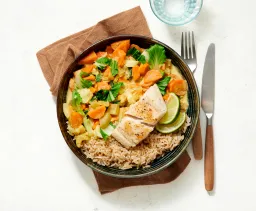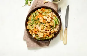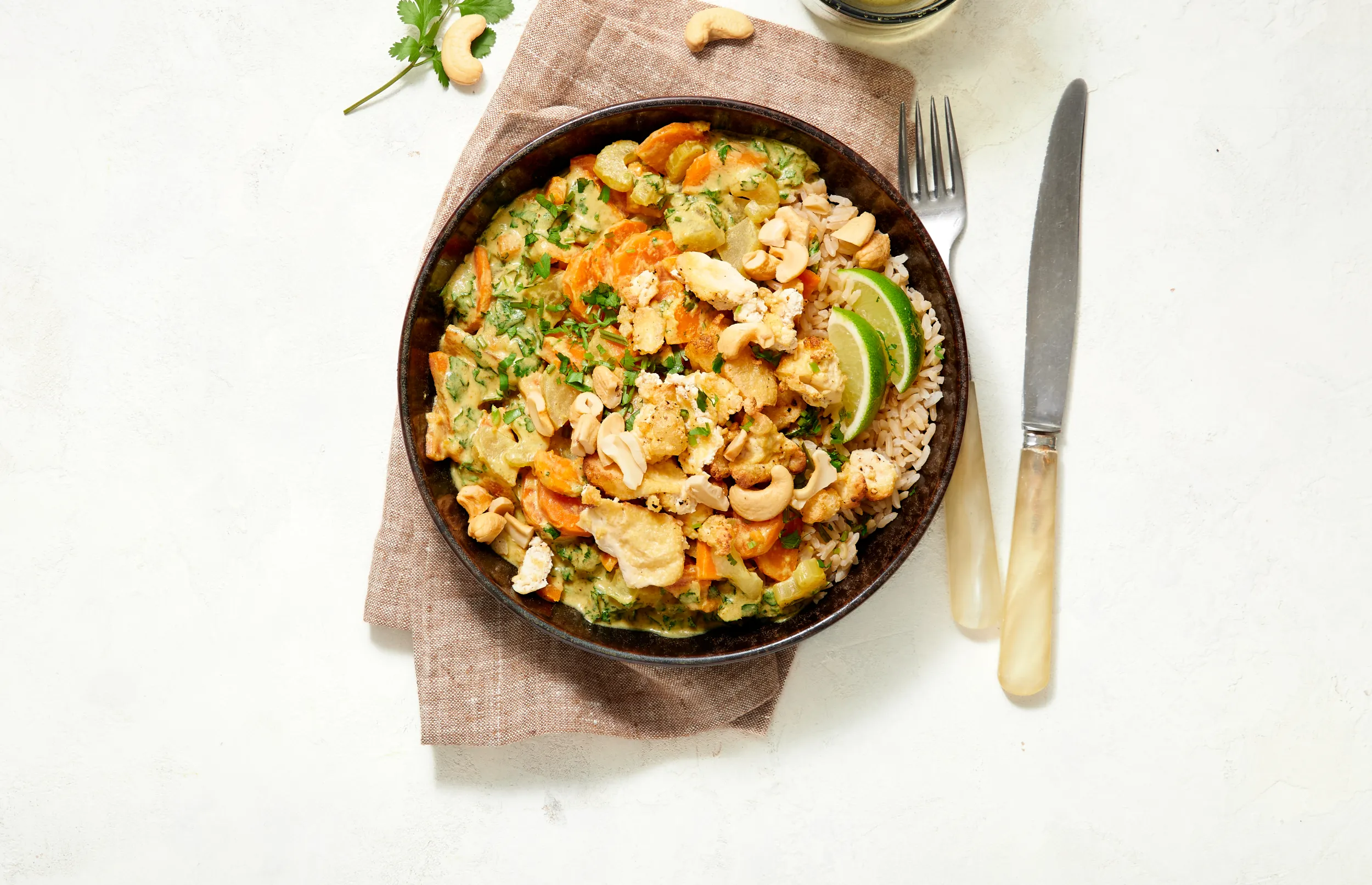 Serveer de curry met de rijst, gepofte tofu en cashewnoten en laat ieder er limoensap naar smaak over knijpen.