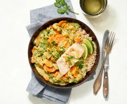 Maak ruimte vrij in het midden van de pan en bak ½ zakje currypasta even aan. Roer door de groenten en voeg ¾ pakje kokosmelk en het water toe. Breng aan de kook en laat afgedekt zachtjes ca. 8 minuten pruttelen.