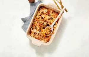 Vet een ovenschaal in en maak een lasagne van 2 of 3 lagen: verdeel plakken knolselderij op de bodem, schep wat van het groentemengsel erover. Doe dit nog één of twee keer en strooi als laatst 75 g vegan geraspte kaas erover. Schuif ca.10 minuten in de oven totdat er een mooi bruin korstje op zit (of zet even de grill aan).