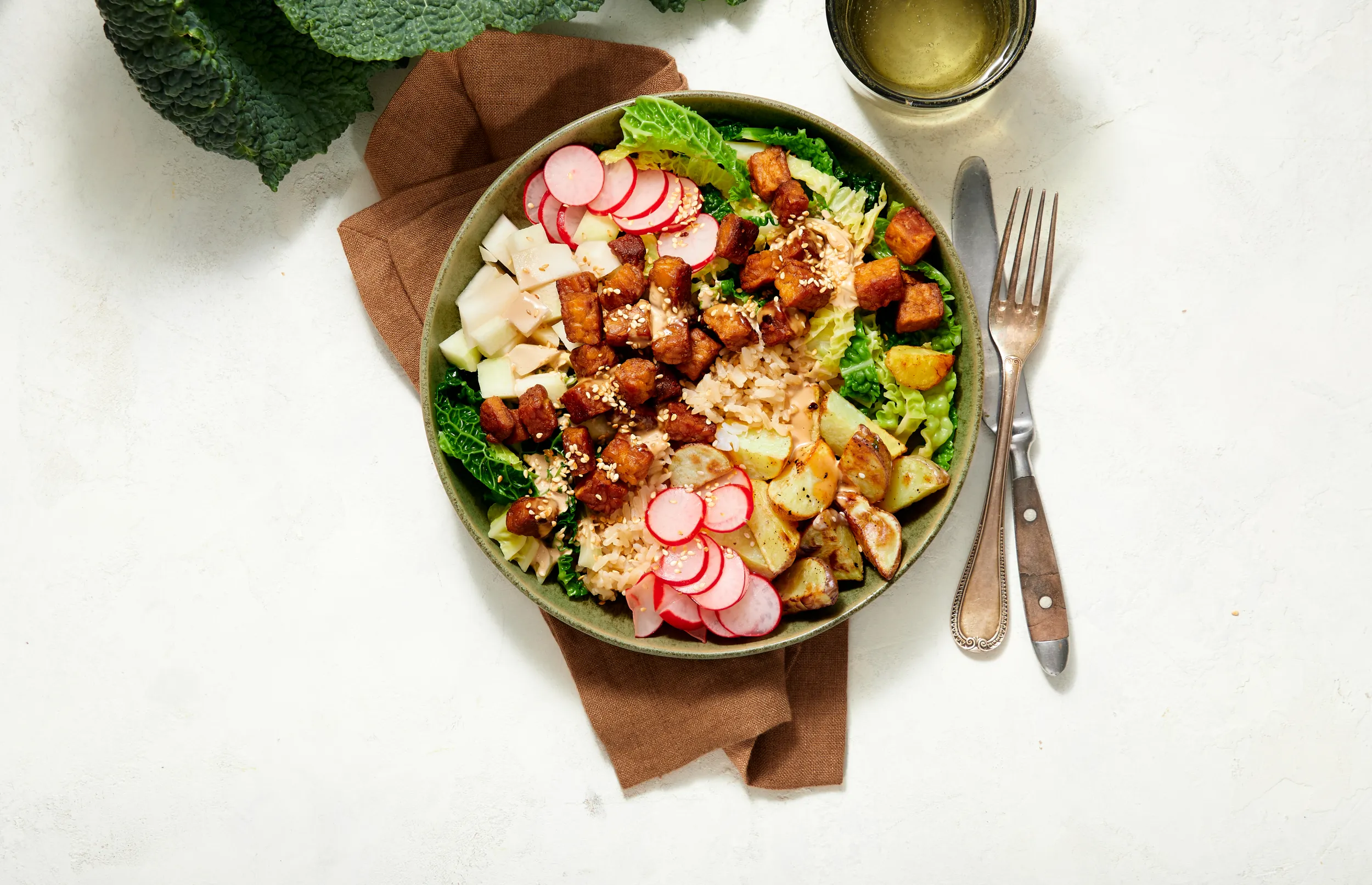 Maak voor ieder een bowl met rijst, groenten en tempeh. Besprenkel royaal met de saus en ½ zakje sesamzaad.