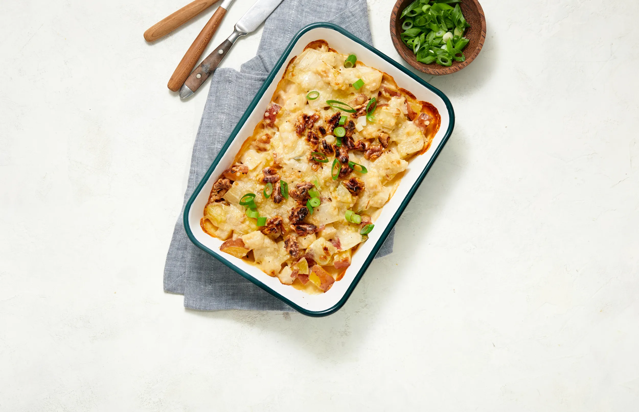 Doe het geheel in een ingevette ovenschaal, strooi de rest van de kaas en 40 g walnoten eroverheen. Zet ca. 10 minuten in de oven zodat er een korstje op komt en de walnoten wat gekleurd zijn. Zet evt. nog even de grill erbij aan (blijf erbij!).