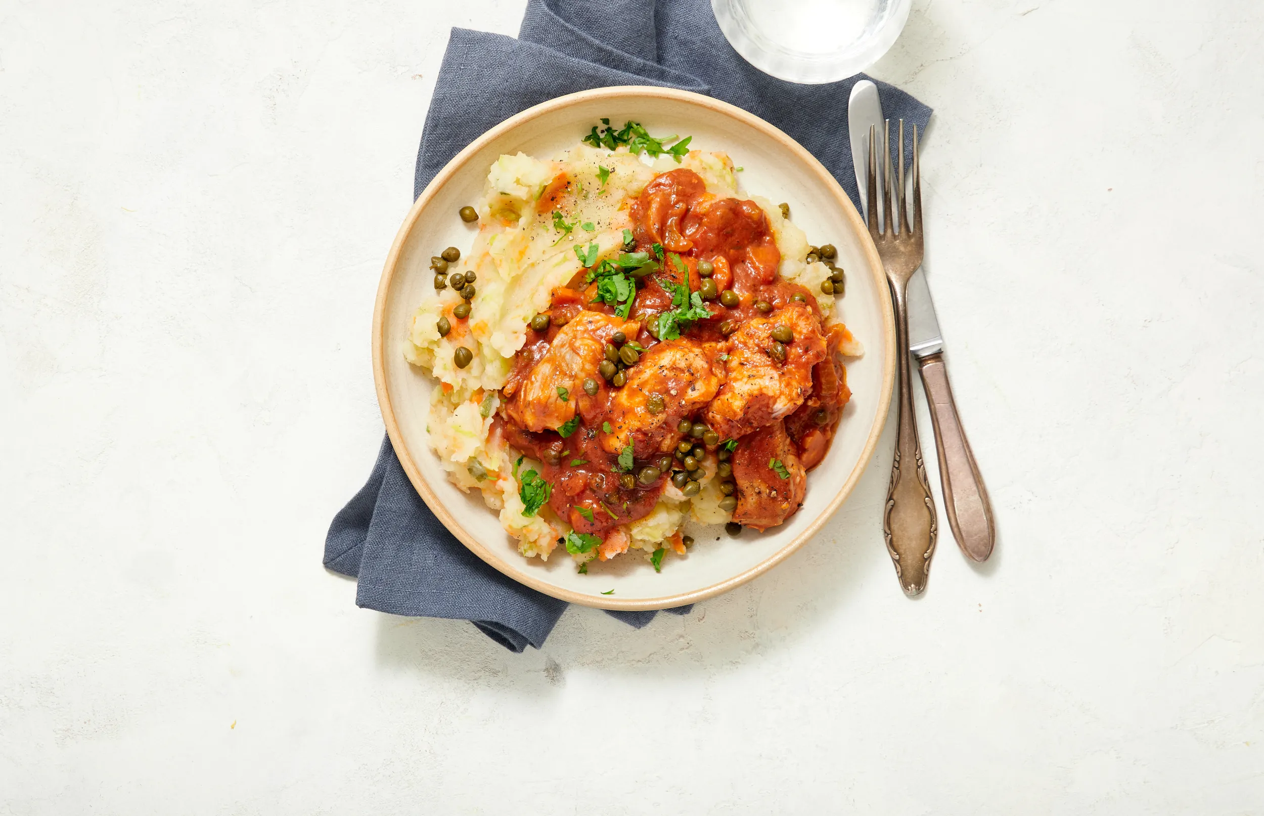 Serveer de vis in tomatensaus met de preistampot. Garneer met 1½ el kappertjes en peterselie.