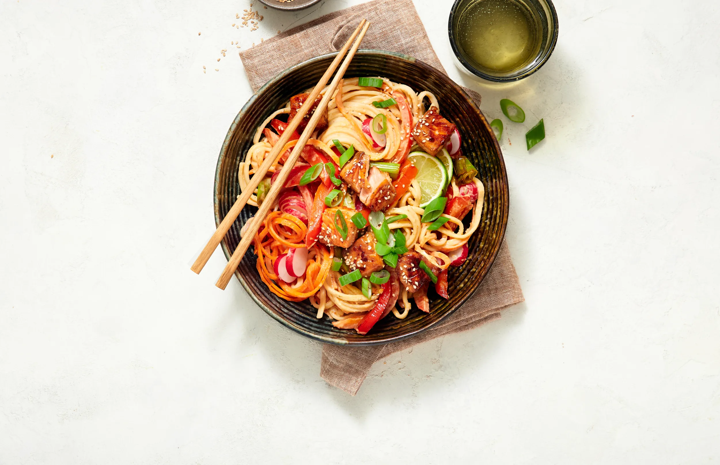 Serveer de lauwwarme noedelsalade met de zalmstukjes en bestrooi met de ringetjes lente-ui en ½ zakje sesamzaad.