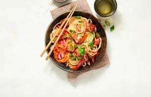 Verwarm olie in een koekenpan of wok. Snij 1 stuks paprika in reepjes, bak even aan. Snij ½ stuk peper in ringetjes (verwijder eventueel zaadlijsten), bak mee. Snij het witte en lichtgroene deel van 1 stengel lente-ui in stukken van 2 cm (bewaar het donkergroen ter garnering). Bak nog ca. 5 minuten mee. Breng op smaak met peper en zout.
