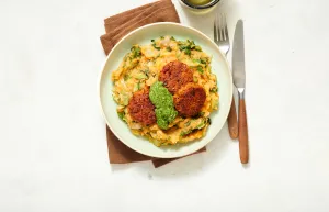 Serveer de andijviestamppot met de burgertjes en pistou.