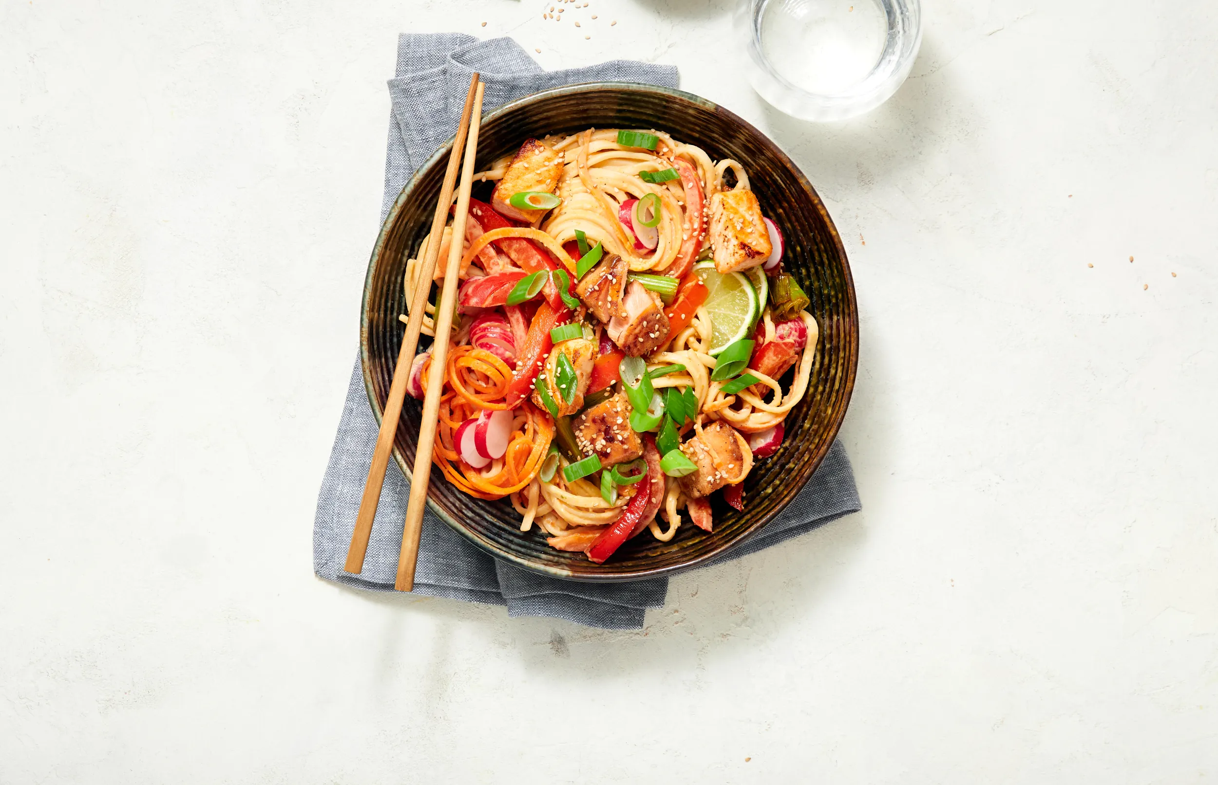 Noedelsalade met thaise dressing en gebakken zalm