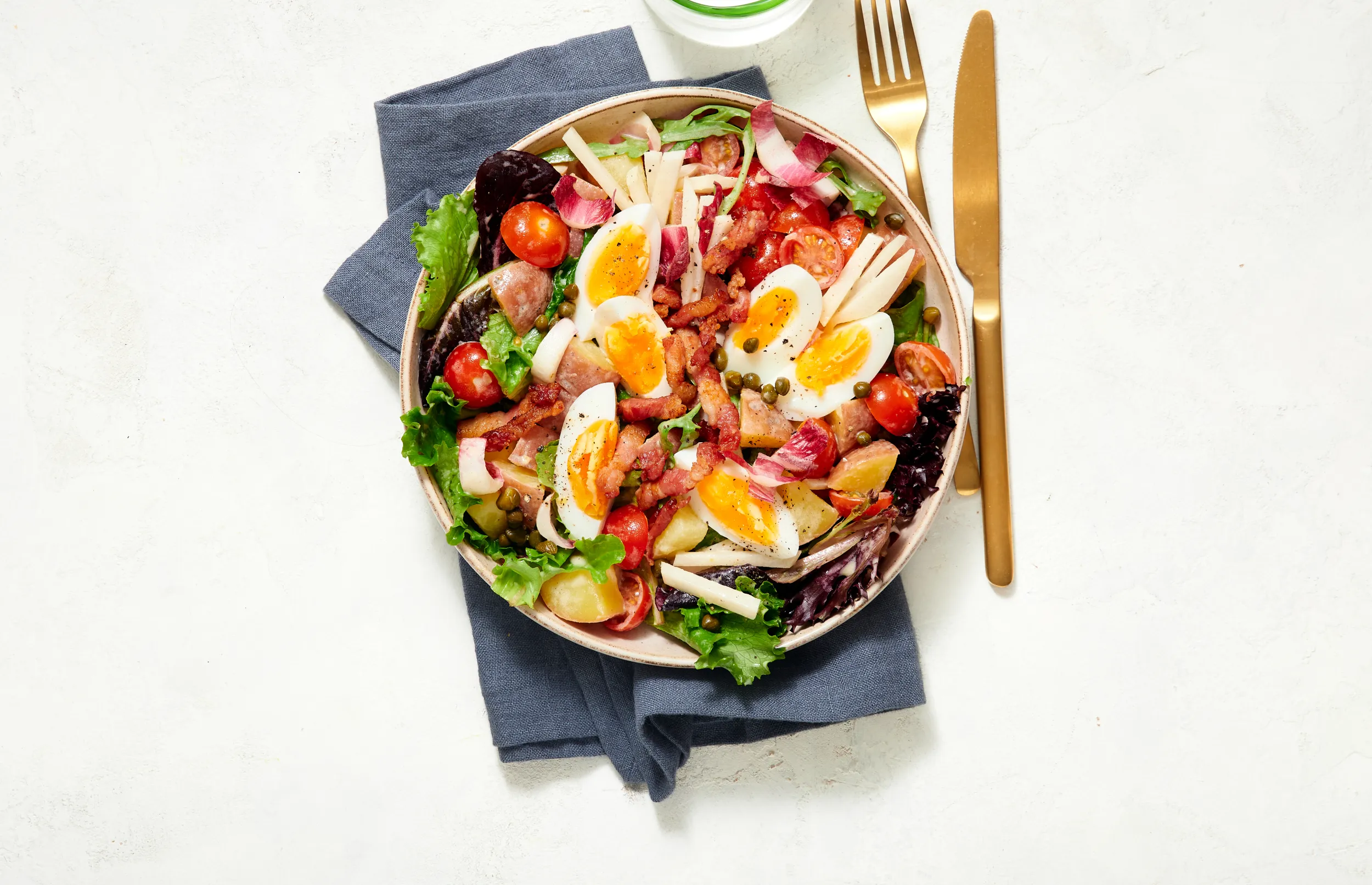 Meng vlak voor serveren de sla door de salade. Verdeel de spekjes en ei erover en serveer.