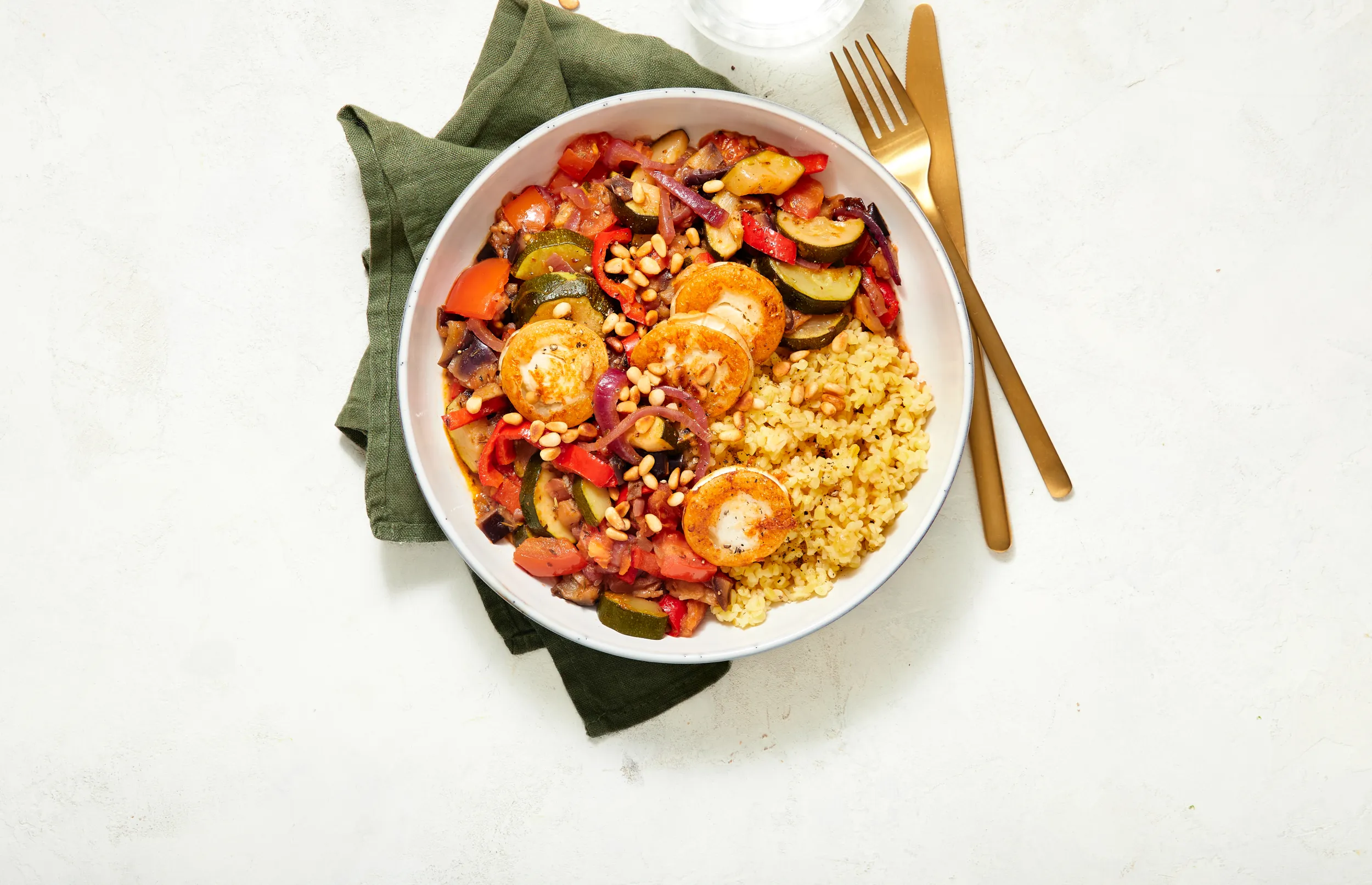 Garneer de ratatouille met de geitenkaas en de pijnboompitjes. Serveer met de bulgur.