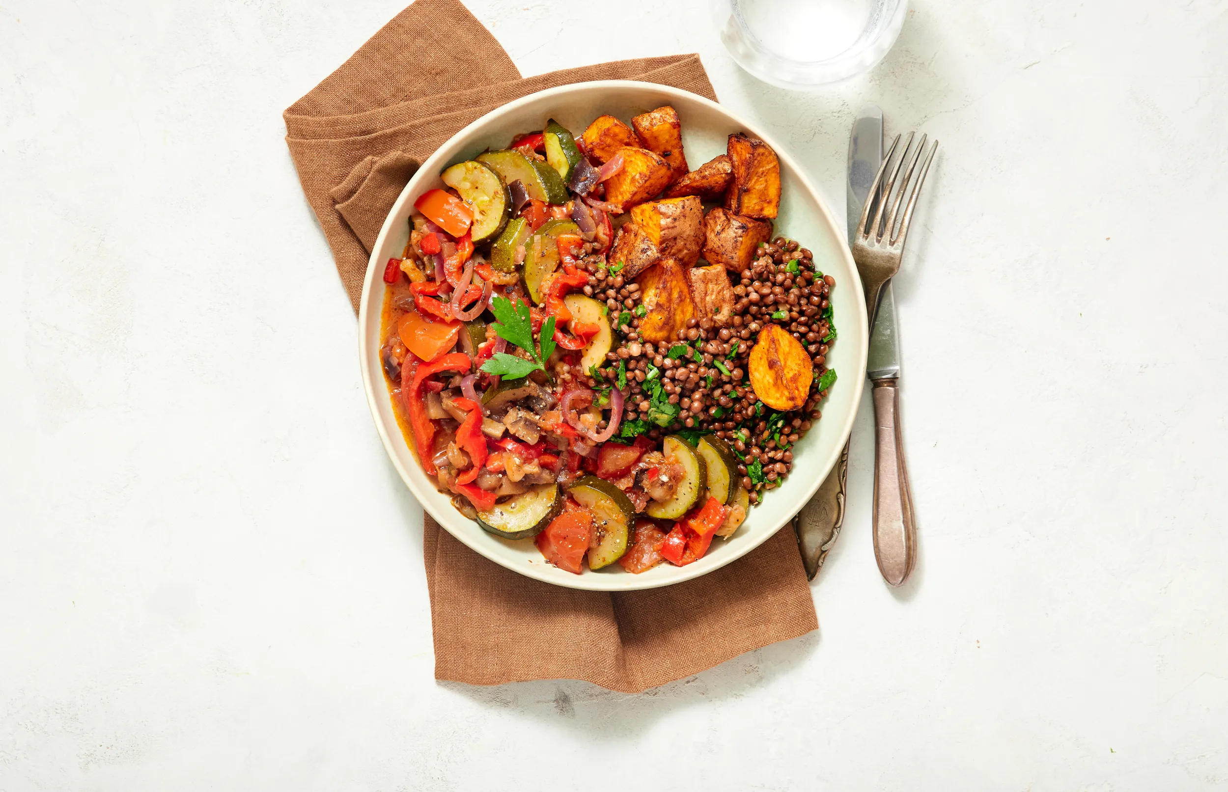 Garneer de ratatouille met de pijnboompitjes. Serveer met de gebakken aardappeltjes en de linzensalade.
