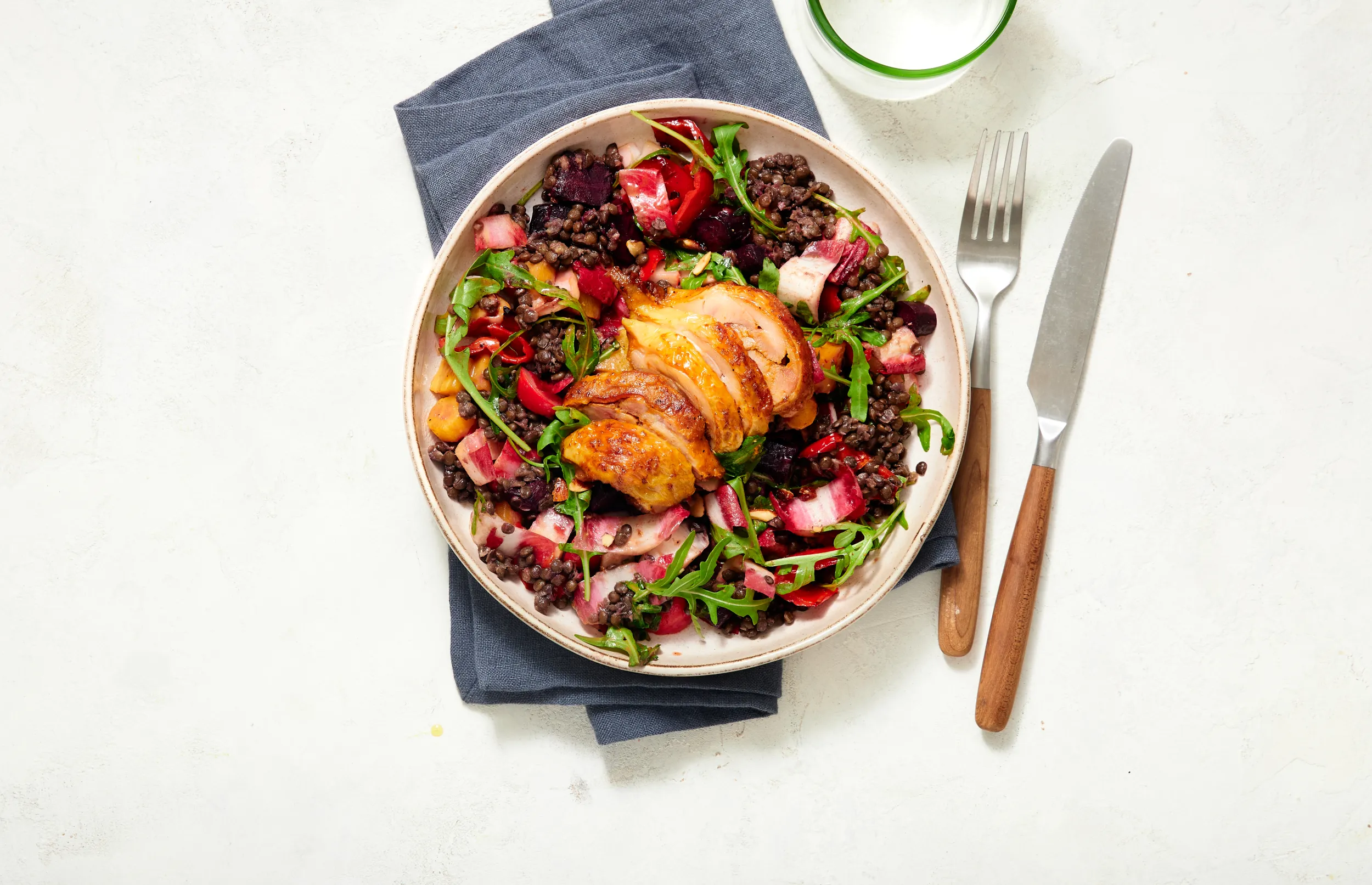 Giet ½ bosje radijs af. Meng de radijsjes, linzen, groenten uit de oven, roodlof en rucola door de vinaigrette. Serveer met de plakjes kip en eventueel een lepel pesto.