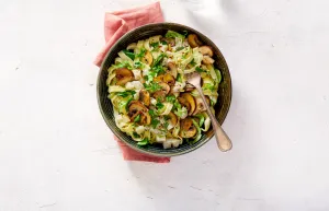 Kook 150 g tagliatelle in 9-11 minuten al dente (je hebt extra pasta gekregen voor grote eters). Let op: roer in het begin goed om plakken te voorkomen. Giet af, maar bewaar wat kookvocht.