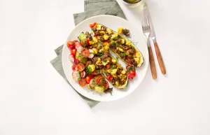Haal de courgettes uit de oven, vul met het gehakt. Bestrooi met de rest van de kruiden en serveer met de tomaten-krieltjessalade.
