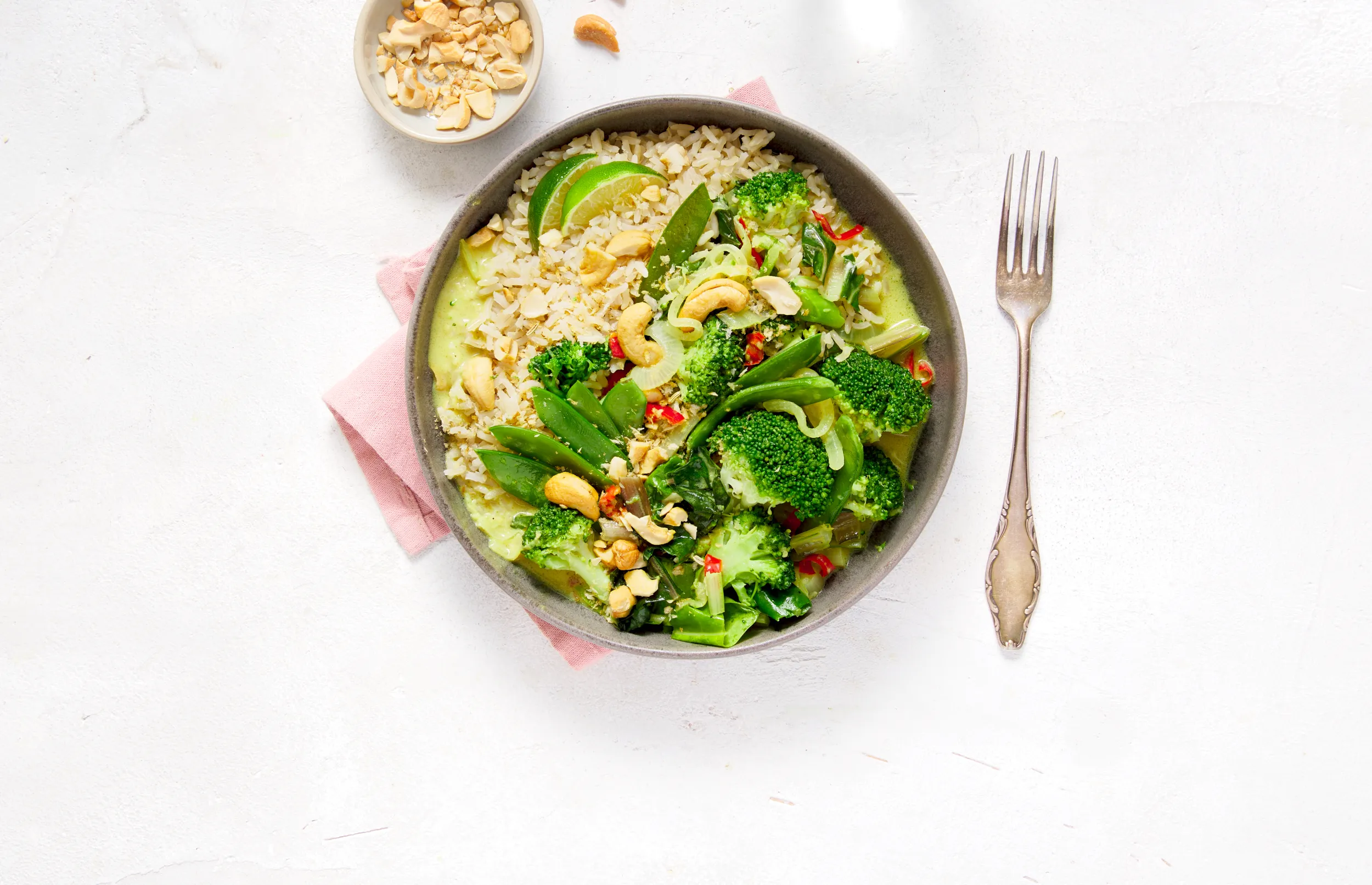 Roer het snijbietblad door de kokosmelk en laat slinken. Voeg ook de broccoli en snijbonen toe. Breng op smaak met een kneepje limoensap, peper en zout. Serveer met rijst en bestrooi met de cashew-panko-limoencrunch.