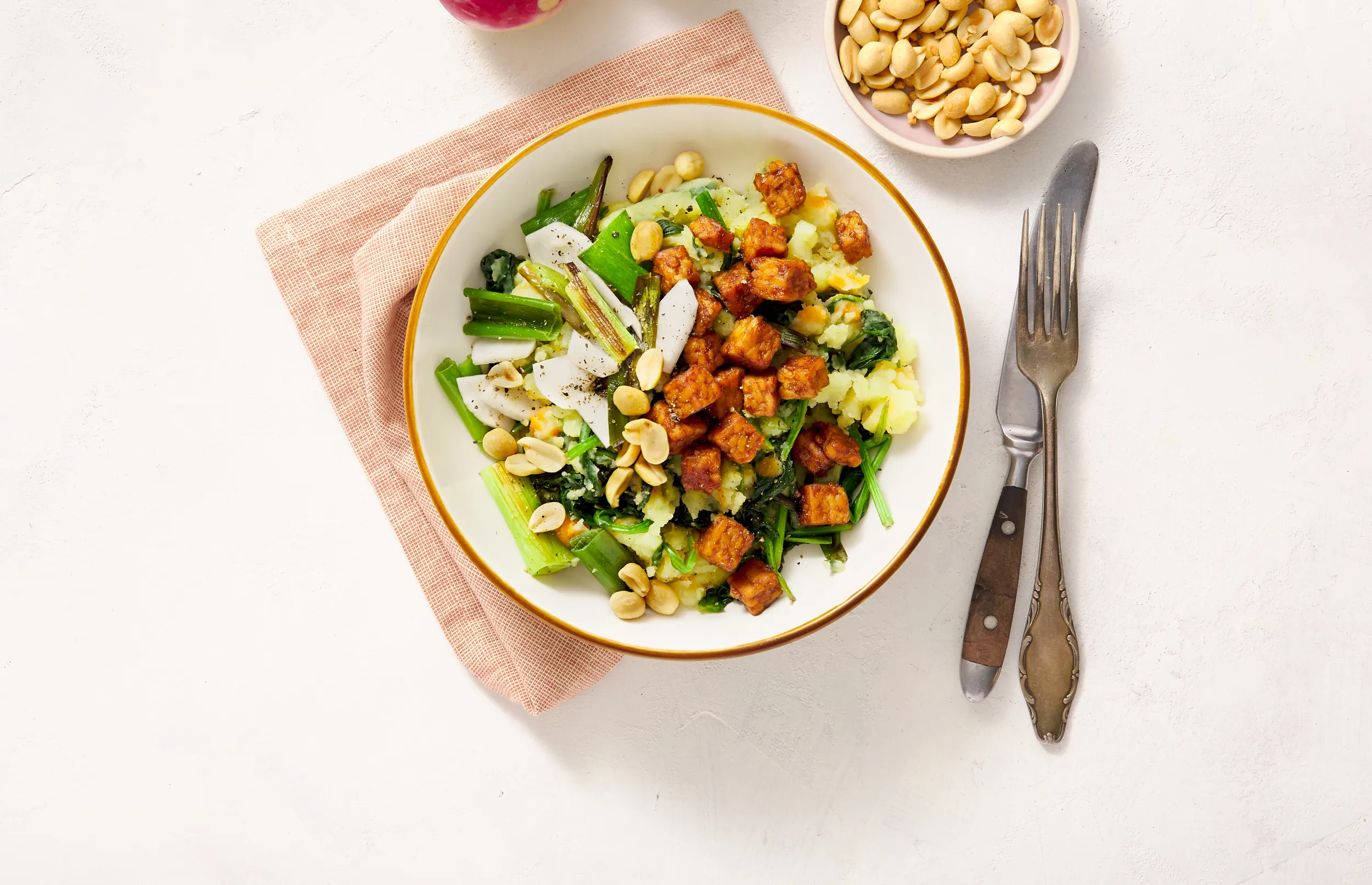 Serveer de tempeh met de stamppot, de ingelegde meiraap en 25 g pinda's.
