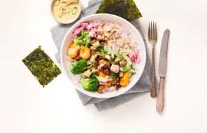 Maak voor iedereen een bowl met de rijst, wortel, bloemkool, biet, komkommer en PLNT stukjes. Serveer met de sojadressing, ringetjes lente-ui en nori.