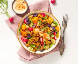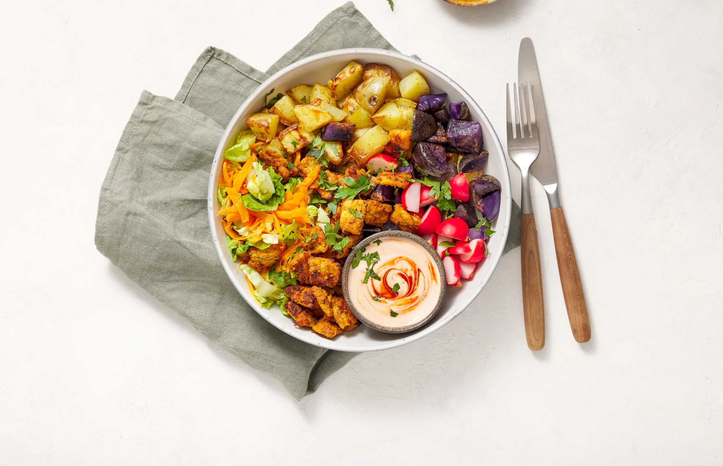 Maak per persoon een bowl van de zoete aardappel, aardappeltjes, wortel, ingelegde radijs, little gem en soja chunks. Serveer met ¾ bakje sriracha yoghurt en garneer met de peterselie.