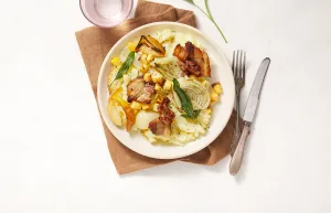 Verwijder loof en onderkant van 1 stuk venkel en snij in stevige plakken. Voeg bij de koolraap samen met 3 teentjes knoflook in de schil en 175 g buikspek.