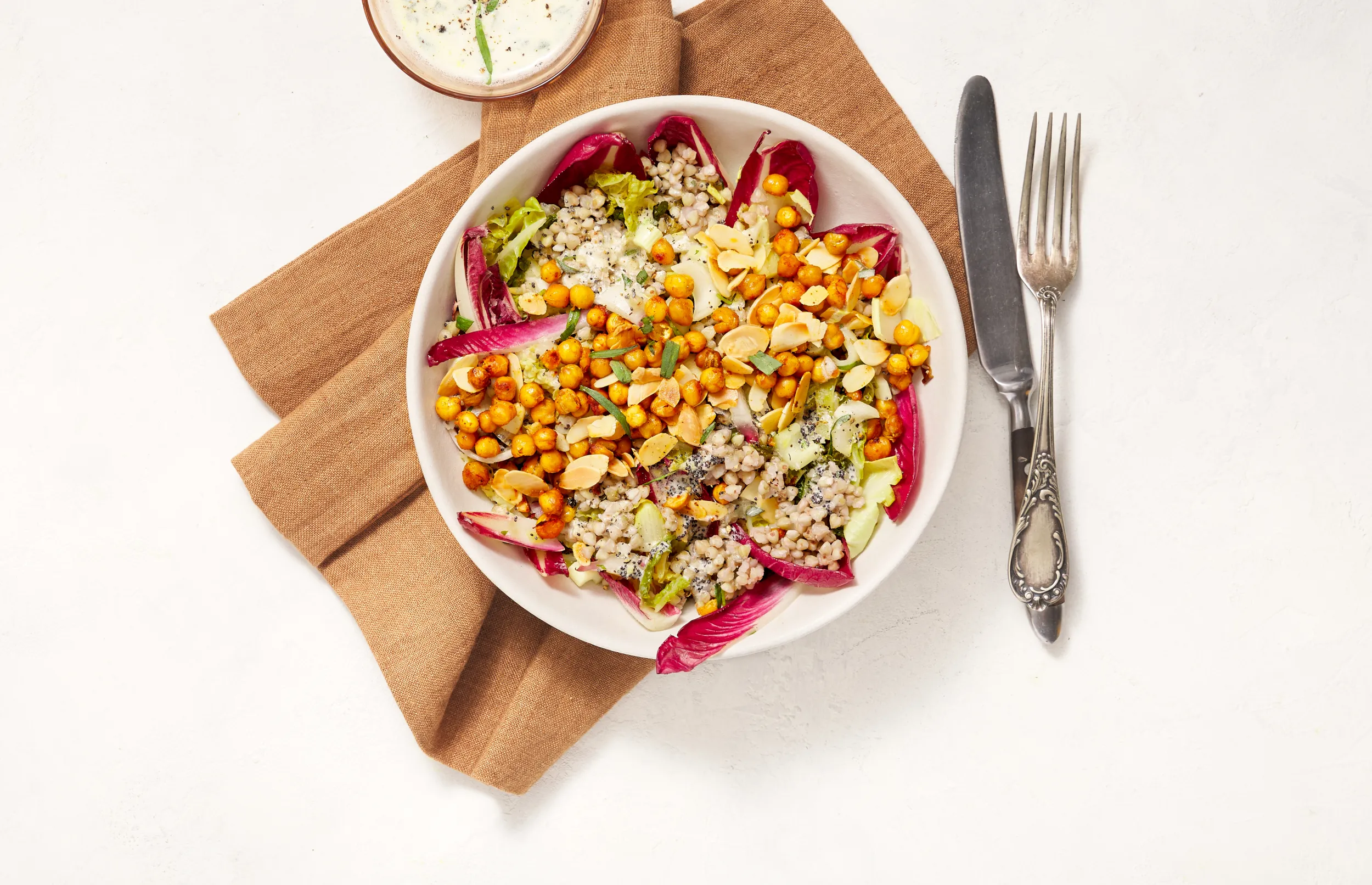 Serveer de boekweit met de kikkererwten en het amandelschaafsel. Garneer met de overige dragon.