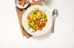 Serveer de soep met de miso-croutons en peterselie. Breng op smaak met een kneepje citroensap.