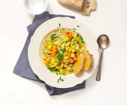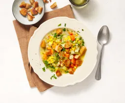 Serveer de soep met de miso-croutons en peterselie. Breng op smaak met een kneepje citroensap.