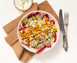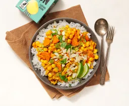 Pureer ½ pakje tofu met een staafmixer in een maatbeker tot een glad mengsel. Voeg als laatst bij de soep als de aardappelen gaar zijn, samen met 1 blikje/potje mais. Check of de soep de juiste dikte heeft naar je smaak, voeg anders nog wat vegan melk of water toe. Warm nog even zachtjes door, laat het niet koken(!).