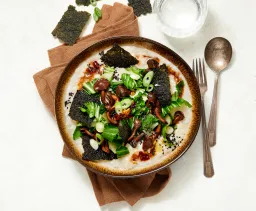 Geef ieder een grote kom rijstsoep en laat ze daarbij bundelzwammen, paksoi en 3 halve eitjes opscheppen. Garneer met de lente-ui en zwart sesamzaad. Breng op smaak met de chili-knoflookolie en eventueel nog wat sojasaus naar smaak.