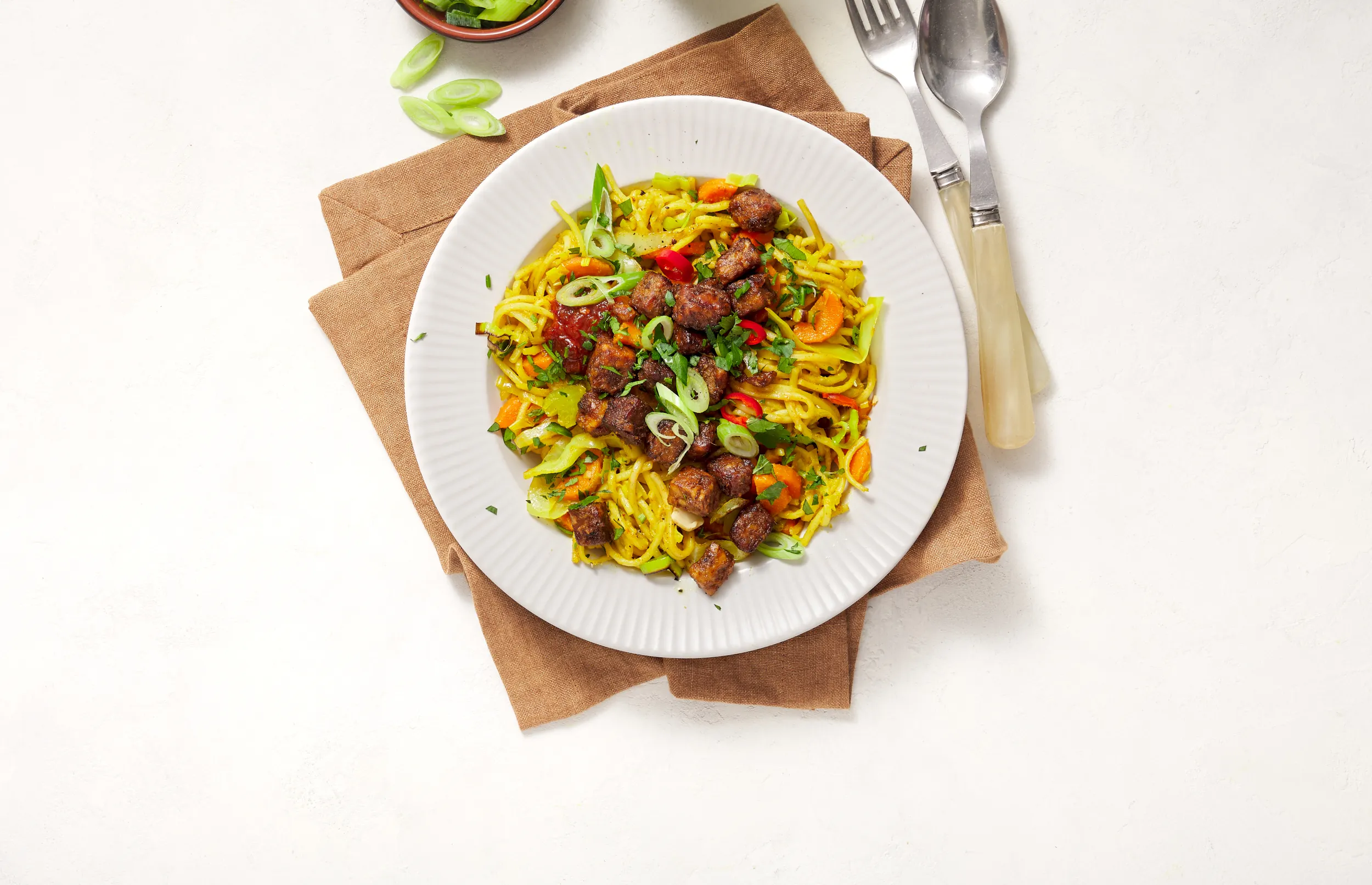 Mie goreng met Bumi tempeh, witte kool, wortel, prei, lente-ui en ei