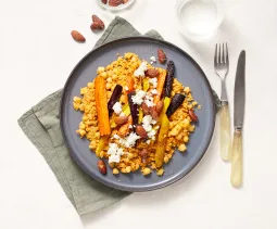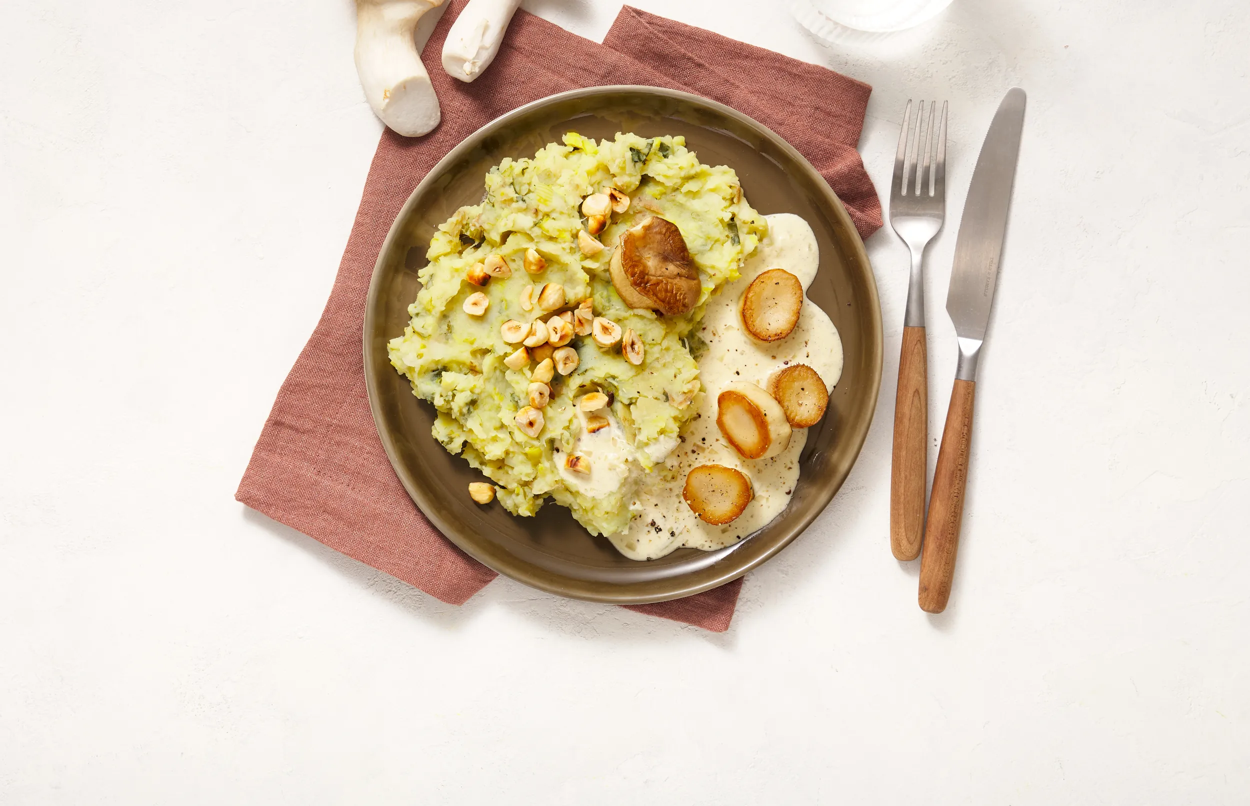 Serveer de puree met de vega coquilles in miso-roomsaus. Bestrooi met de hazelnoten.
