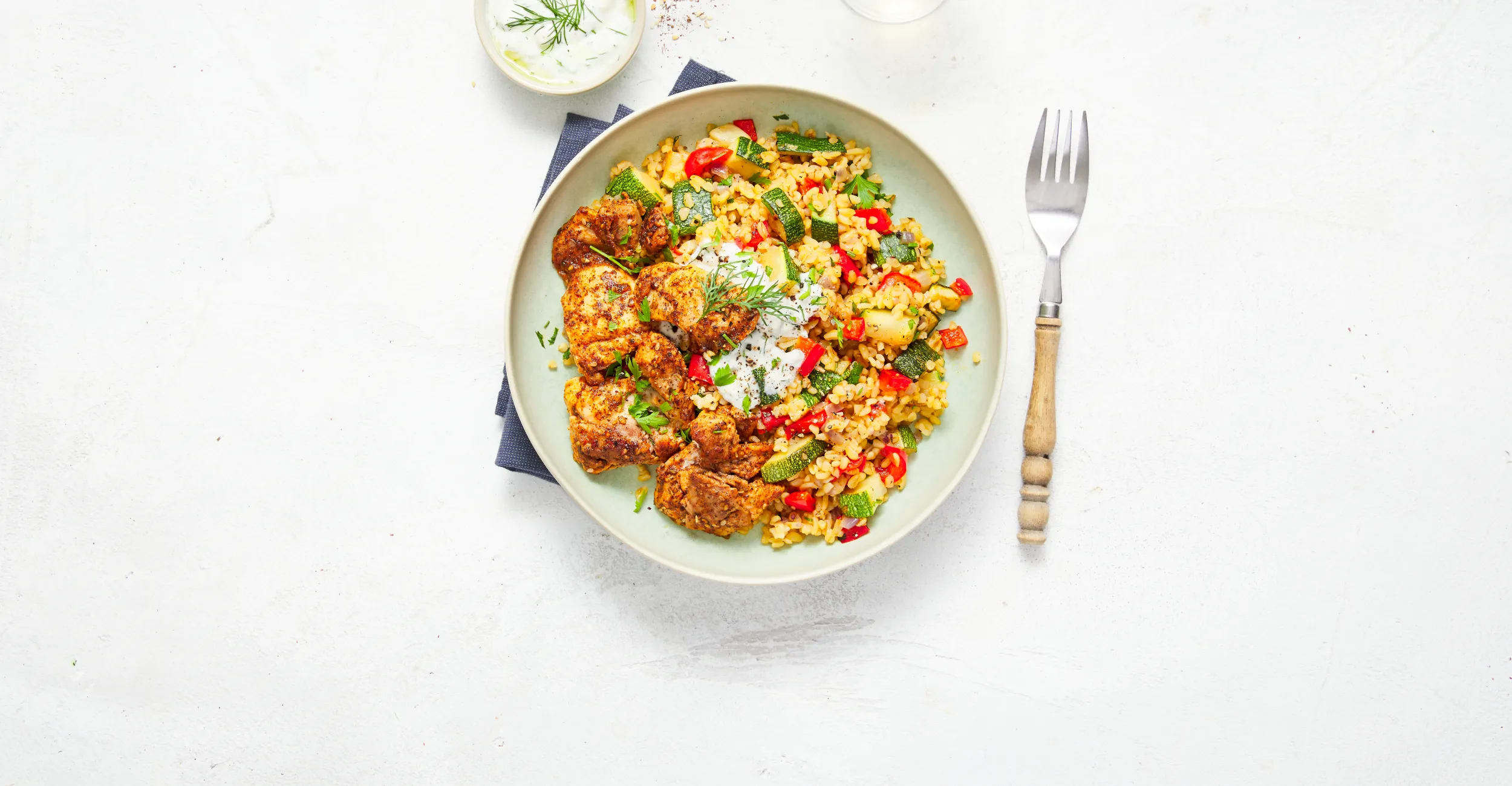 Serveer de bulgur met de Midden-Oosterse kip en kruidenyoghurt.